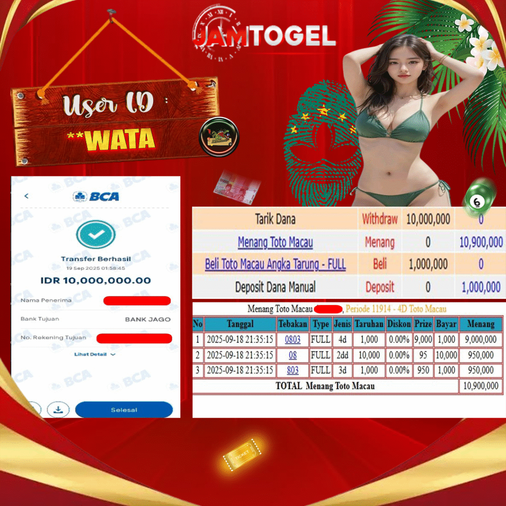 Selamat kepada member setia JAMTOGEL ID **WATA Telah menang dalam permainan TOTO MACAU RP 10,000,000, – LUNAS langsung mendarat ke rekening tanpa bertele – tele atau syarat apapun. Kami ucapkan terimakasih telah mempercayakan JAMTOGEL sebagai situs bandar terpercaya yang dijamin aman dikarenakan berapapun kemenangan member pasti LUNAS!