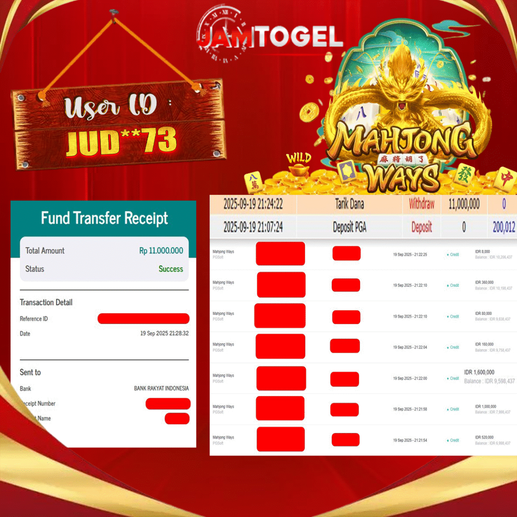 Selamat kepada member setia JAMTOGEL ID JUD**73 Telah menang dalam permainan SLOT MAHJONG WAYS RP 11.000,000, – LUNAS langsung mendarat ke rekening tanpa bertele – tele atau syarat apapun. Kami ucapkan terimakasih telah mempercayakan JAMTOGEL sebagai situs bandar terpercaya yang dijamin aman dikarenakan berapapun kemenangan member pasti LUNAS!