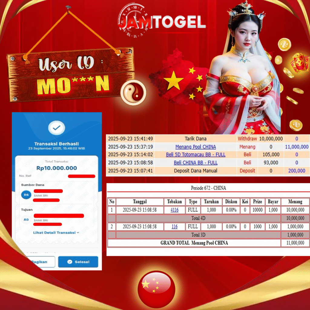 Selamat kepada member setia JAMTOGEL ID MO***N Telah menang dalam permainan CHINA POOLS RP 10,000,000, – LUNAS langsung mendarat ke rekening tanpa bertele – tele atau syarat apapun. Kami ucapkan terimakasih telah mempercayakan JAMTOGEL sebagai situs bandar terpercaya yang dijamin aman dikarenakan berapapun kemenangan member pasti LUNAS!