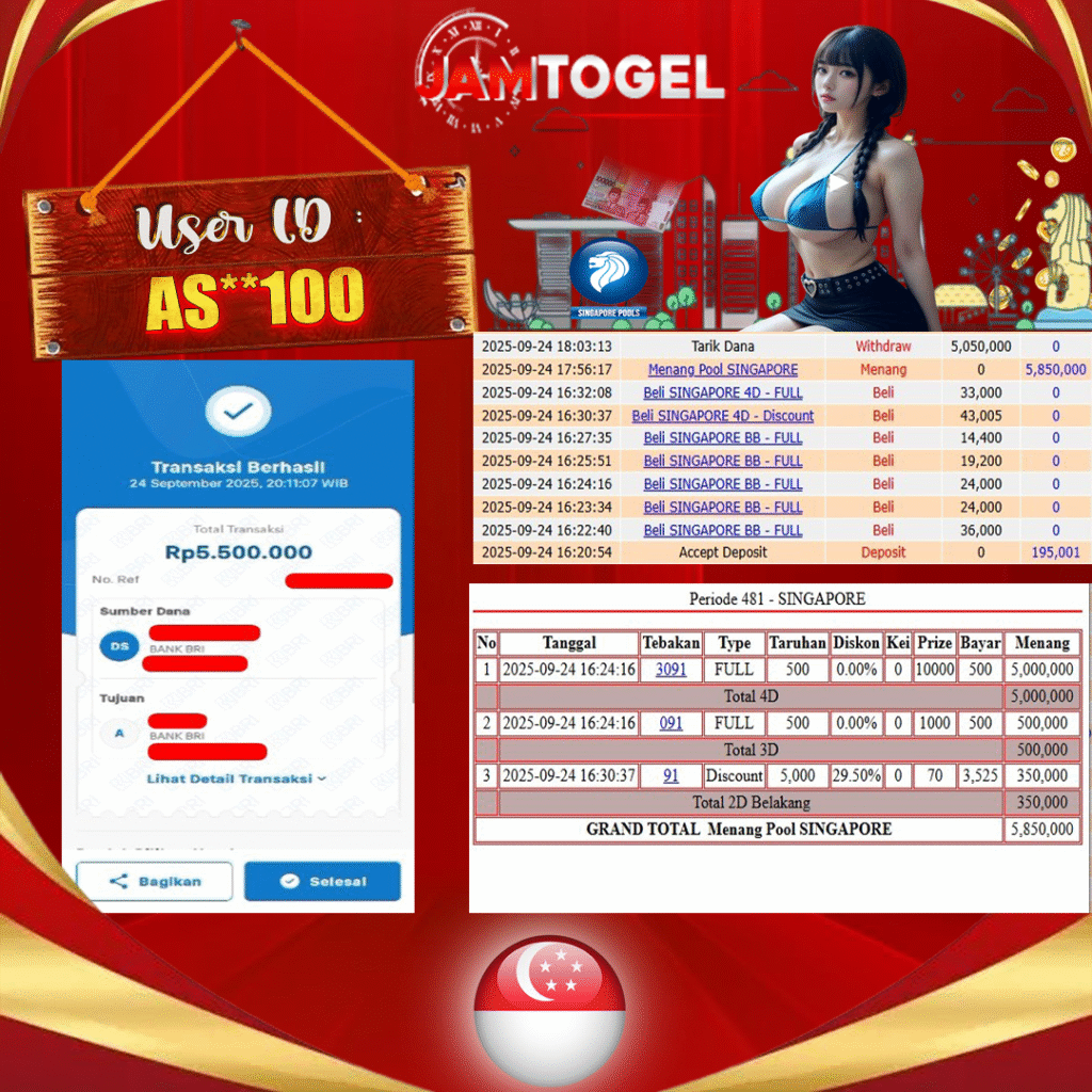Selamat kepada member setia JAMTOGEL ID AS**100 Telah menang dalam permainan SINGAPORE POOLS RP 5,500,000, – LUNAS langsung mendarat ke rekening tanpa bertele – tele atau syarat apapun. Kami ucapkan terimakasih telah mempercayakan JAMTOGEL sebagai situs bandar terpercaya yang dijamin aman dikarenakan berapapun kemenangan member pasti LUNAS!