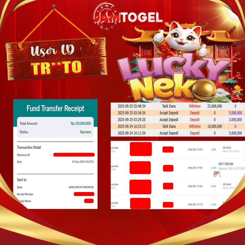 Selamat kepada member setia JAMTOGEL ID TR**TO Telah menang dalam permainan SLOT LUCKY NEKO RP 10,000,000, – LUNAS langsung mendarat ke rekening tanpa bertele – tele atau syarat apapun. Kami ucapkan terimakasih telah mempercayakan JAMTOGEL sebagai situs bandar terpercaya yang dijamin aman dikarenakan berapapun kemenangan member pasti LUNAS!