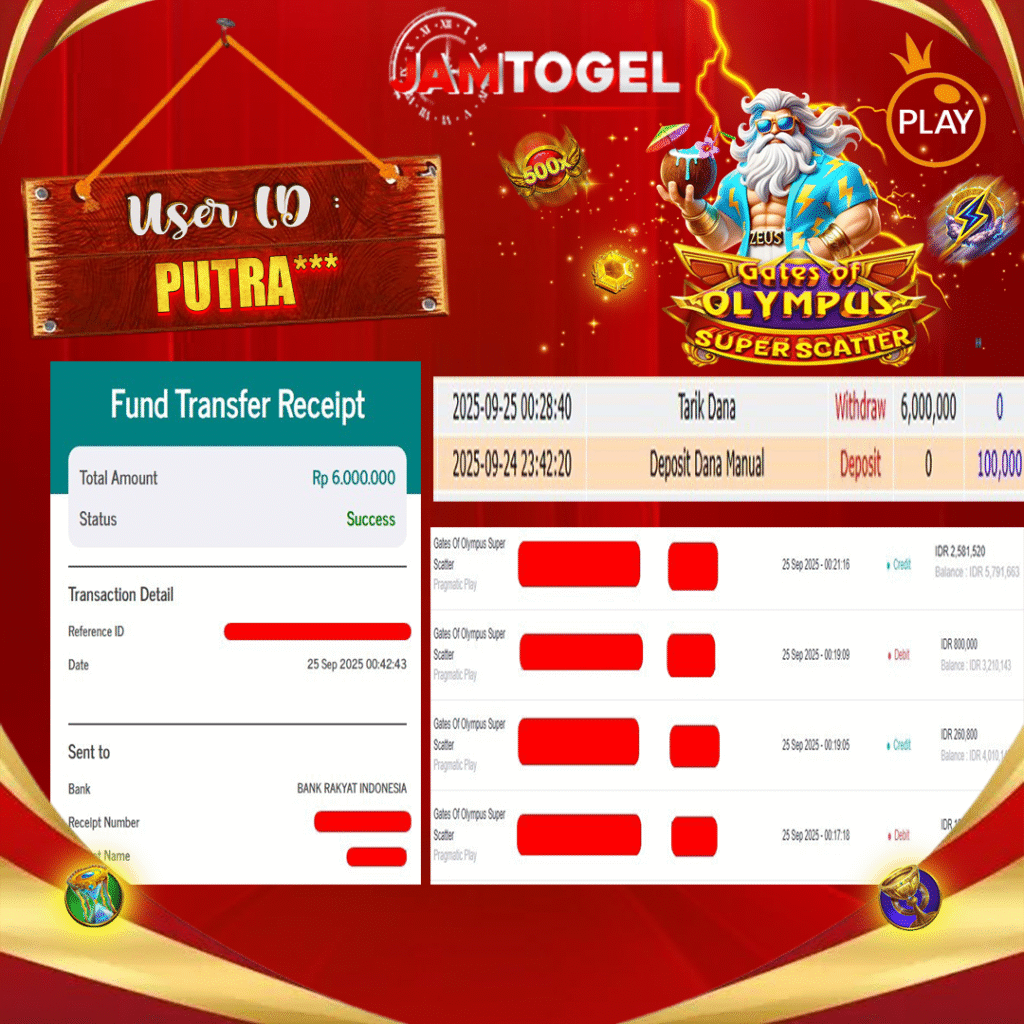 Selamat kepada member setia JAMTOGEL ID PUTRA*** Telah menang dalam permainan SLOT GATE OF OLYMPUS SUPER SCATTER RP 6,000,000 – LUNAS langsung mendarat ke rekening tanpa bertele – tele atau syarat apapun. Kami ucapkan terimakasih telah mempercayakan JAMTOGEL sebagai situs bandar terpercaya yang dijamin aman dikarenakan berapapun kemenangan member pasti LUNAS!