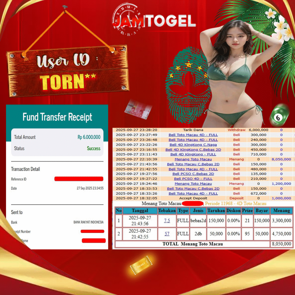 Selamat kepada member setia JAMTOGEL ID TORN** Telah menang dalam permainan TOTO MACAU RP 6,000,000, – LUNAS langsung mendarat ke rekening tanpa bertele – tele atau syarat apapun. Kami ucapkan terimakasih telah mempercayakan JAMTOGEL sebagai situs bandar terpercaya yang dijamin aman dikarenakan berapapun kemenangan member pasti LUNAS!
