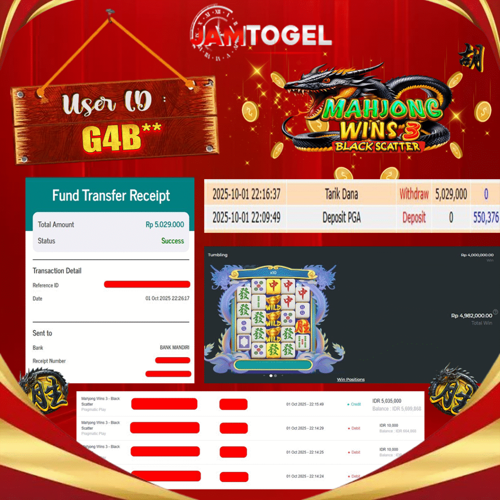 Selamat kepada member setia JAMTOGEL ID G4B** Telah menang dalam permainan SLOT MAHJONG WINS 3 BLACK SCATTER RP 5,029,000, – LUNAS langsung mendarat ke rekening tanpa bertele – tele atau syarat apapun. Kami ucapkan terimakasih telah mempercayakan JAMTOGEL sebagai situs bandar terpercaya yang dijamin aman dikarenakan berapapun kemenangan member pasti LUNAS!