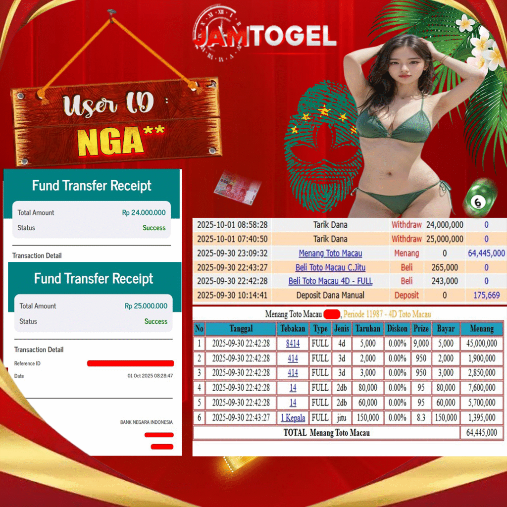 Selamat kepada member setia JAMTOGEL ID NGA**** Telah menang dalam permainan TOTO MACAU RP 49,000,000, – LUNAS langsung mendarat ke rekening tanpa bertele – tele atau syarat apapun. Kami ucapkan terimakasih telah mempercayakan JAMTOGEL sebagai situs bandar terpercaya yang dijamin aman dikarenakan berapapun kemenangan member pasti LUNAS!