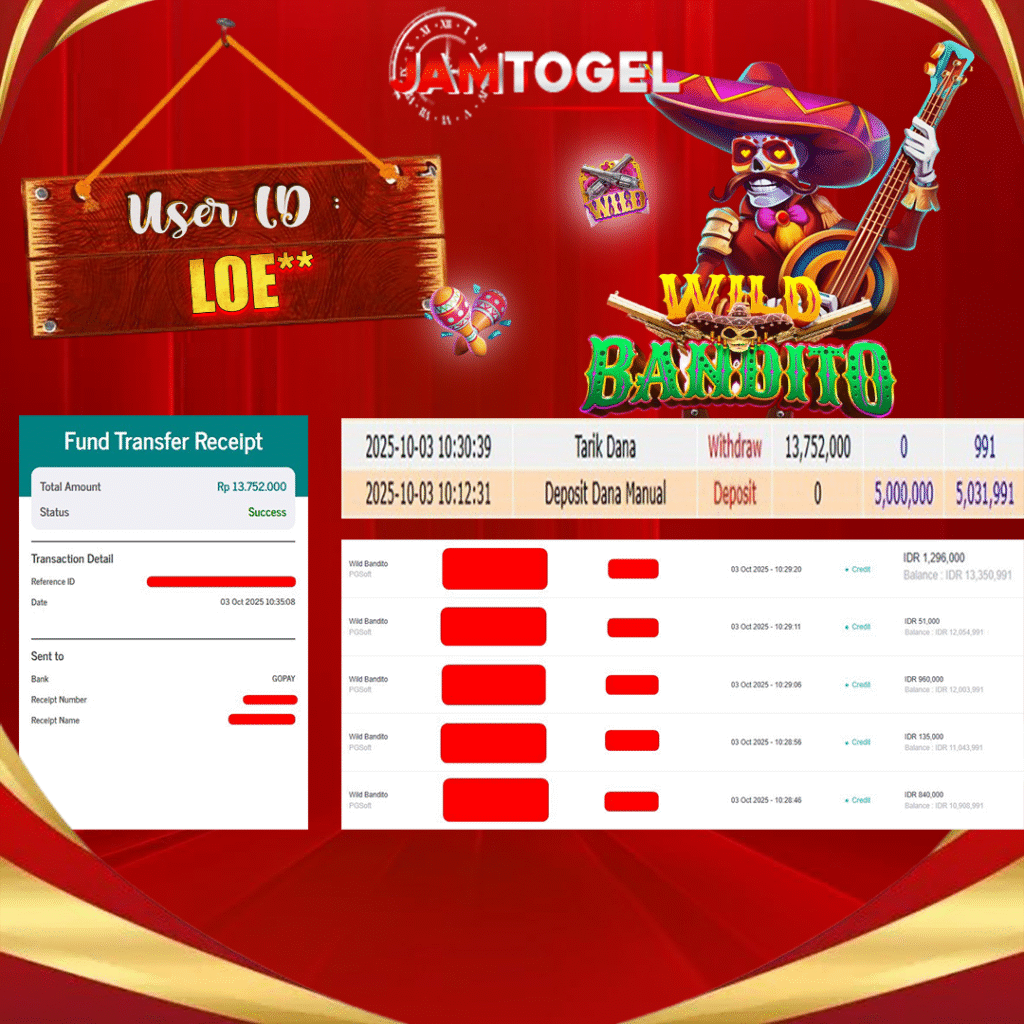Selamat kepada member setia JAMTOGEL ID LOE** Telah menang dalam permainan SLOT WILD BANDITO RP 13,752,000, – LUNAS langsung mendarat ke rekening tanpa bertele – tele atau syarat apapun. Kami ucapkan terimakasih telah mempercayakan JAMTOGEL sebagai situs bandar terpercaya yang dijamin aman dikarenakan berapapun kemenangan member pasti LUNAS!