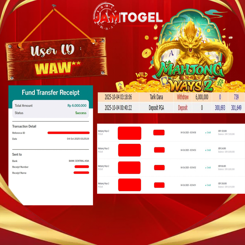 Selamat kepada member setia JAMTOGEL ID WAW** Telah menang dalam permainan SLOT MAHJONG WAYS 2 RP 6,000,000, – LUNAS langsung mendarat ke rekening Dengan Cepat tepat dan aman . Kami ucapkan terimakasih telah mempercayakan JAMTOGEL sebagai situs bandar slot online gacor yang terjamin aman dikarenakan berapapun kemenangan member pasti LUNAS!