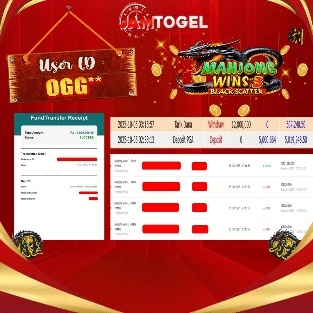 Berhasil menang besar di permainan Slot Mahjong Wins 3 β Black Scatter dengan total hadiah Rp 12.000.000!