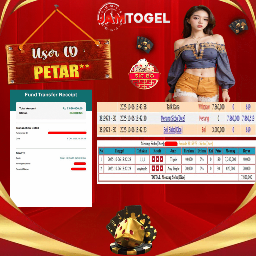 Selamat kepada member setia JAMTOGEL ID PETAR** Telah menang dalam permainan LIVE GAMES SICBO [DICE] RP 7,860,000, – LUNAS langsung mendarat ke rekening tanpa bertele – tele atau syarat apapun. Kami ucapkan terimakasih telah mempercayakan JAMTOGEL sebagai situs bandar terpercaya yang dijamin aman dikarenakan berapapun kemenangan member pasti LUNAS!