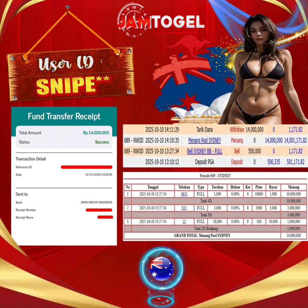 Selamat kepada member setia JAMTOGEL ID SNIPE** Telah menang dalam permainan SYDNEY RP 14,000,000, – LUNAS langsung mendarat ke rekening tanpa bertele – tele atau syarat apapun. Kami ucapkan terimakasih telah mempercayakan JAMTOGEL sebagai situs bandar terpercaya yang dijamin aman dikarenakan berapapun kemenangan member pasti LUNAS!