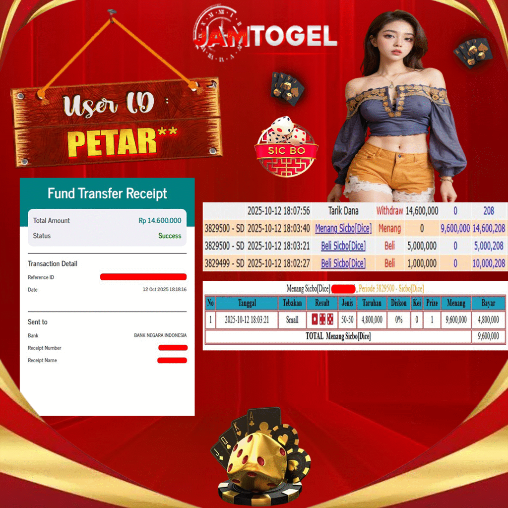 Selamat kepada member setia JAMTOGEL ID PETAR** Telah menang dalam permainan LIVE GAMES SICBO [DICE] RP 14,600,000, – LUNAS langsung mendarat ke rekening tanpa bertele – tele atau syarat apapun. Kami ucapkan terimakasih telah mempercayakan JAMTOGEL sebagai situs bandar terpercaya yang dijamin aman dikarenakan berapapun kemenangan member pasti LUNAS!