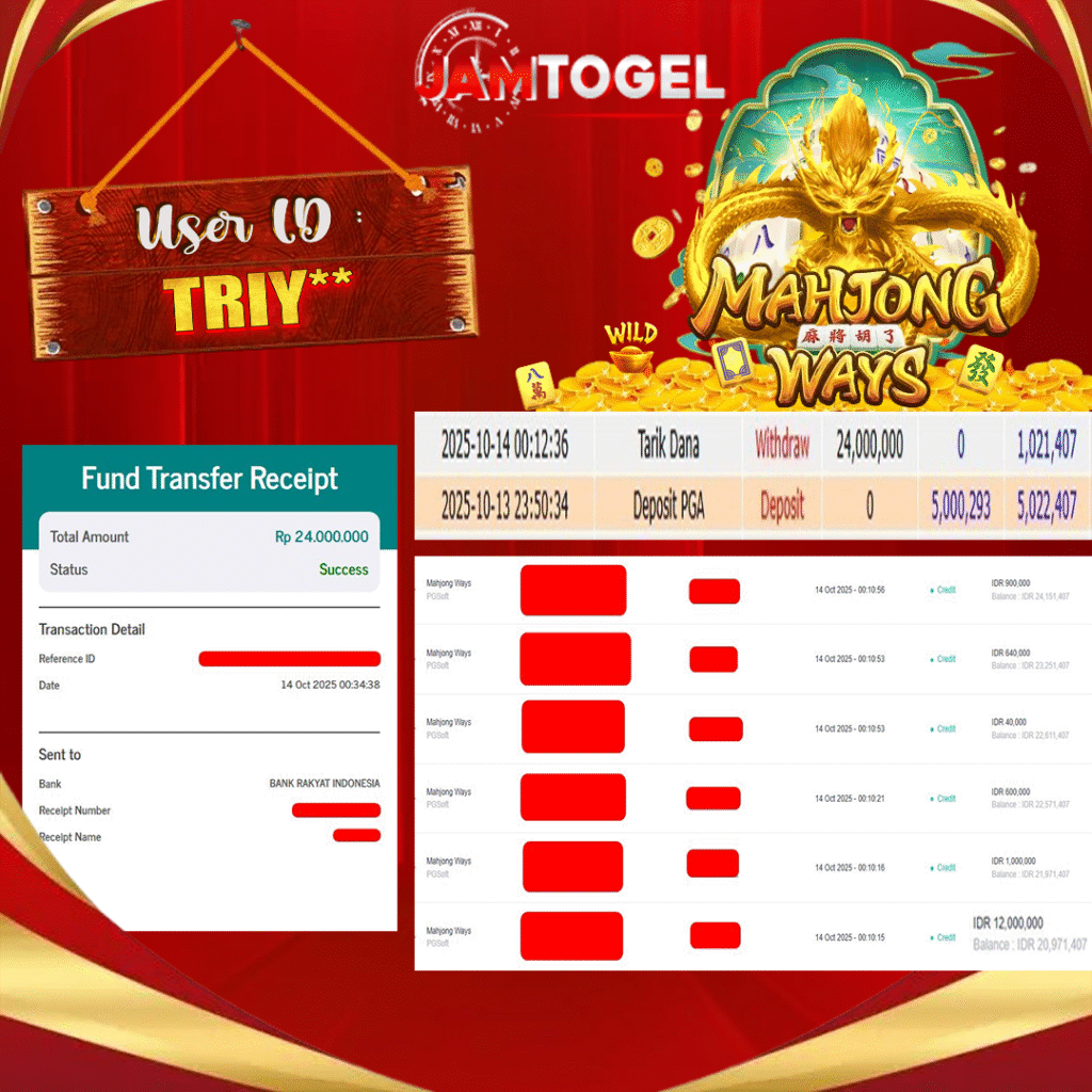 Selamat kepada member setia JAMTOGEL ID TRIY** Telah menang dalam permainan SLOT MAHJONG WAYS RP 24.0000,000, – LUNAS langsung mendarat ke rekening tanpa bertele – tele atau syarat apapun. Kami ucapkan terimakasih telah mempercayakan JAMTOGEL sebagai situs bandar terpercaya yang dijamin aman dikarenakan berapapun kemenangan member pasti LUNAS!