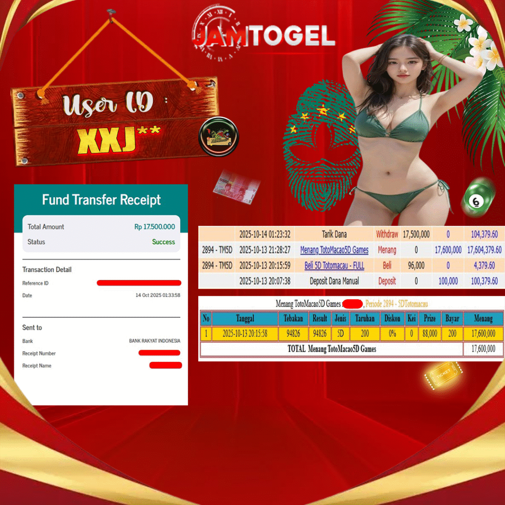 Selamat kepada member setia JAMTOGEL ID XXJ** Telah menang dalam permainan TOTO MACAU 5D RP 17,500,000, – LUNAS langsung mendarat ke rekening tanpa bertele – tele atau syarat apapun. Kami ucapkan terimakasih telah mempercayakan JAMTOGEL sebagai situs bandar Togel online terpecaya dijamin aman dikarenakan berapapun kemenangan member pasti LUNAS!