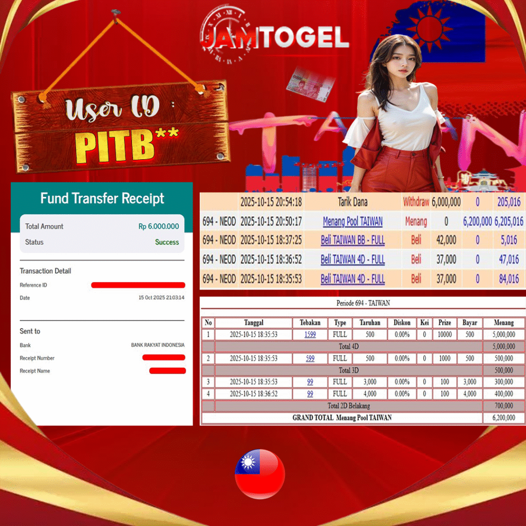 Selamat kepada member setia JAMTOGEL ID PITB**88 Telah menang dalam permainan TAIWAN POOLS RP 6,000,000, – LUNAS langsung mendarat ke rekening tanpa bertele – tele atau syarat apapun. Kami ucapkan terimakasih telah mempercayakan JAMTOGEL sebagai situs bandar terpercaya yang dijamin aman dikarenakan berapapun kemenangan member pasti LUNAS!
