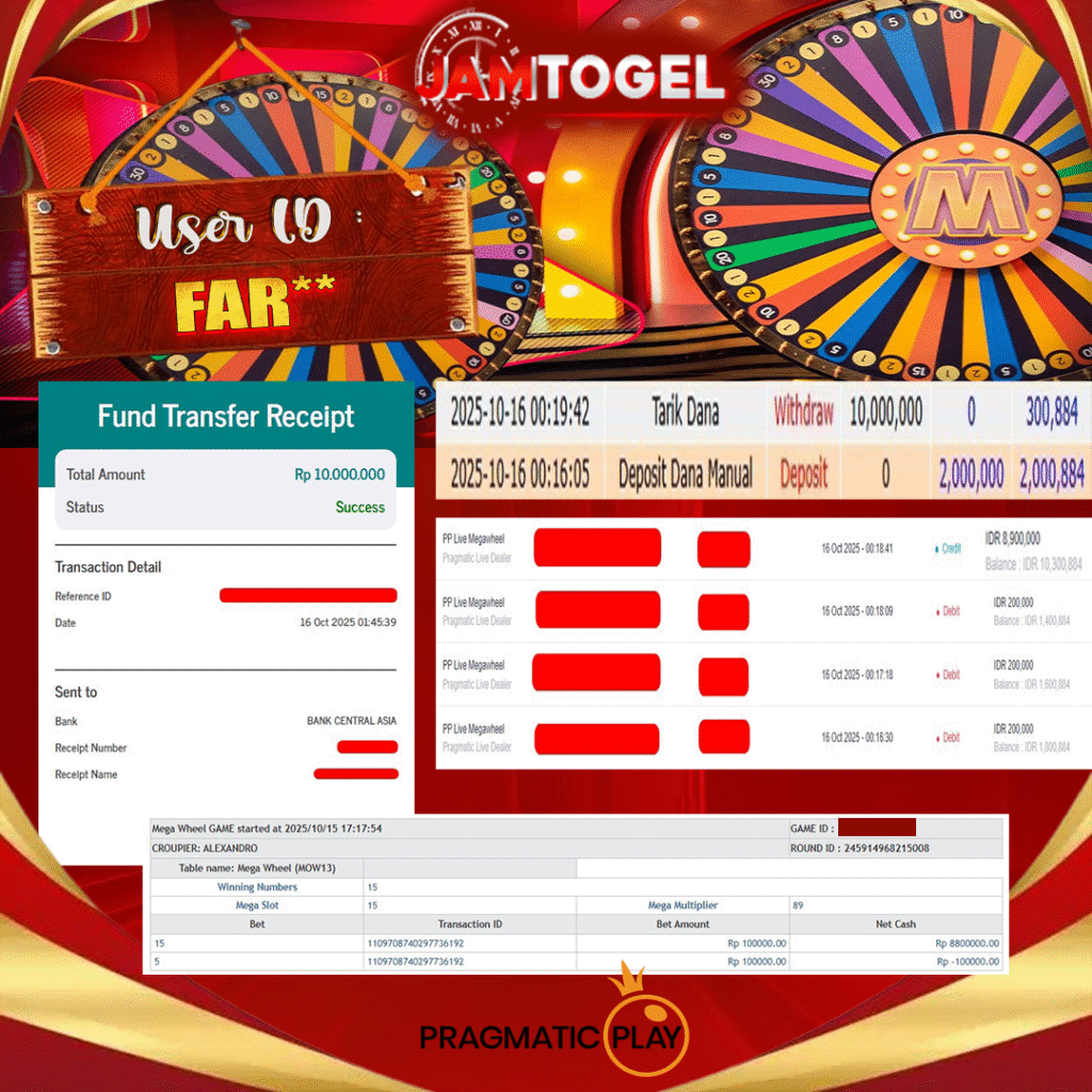 Selamat kepada member setia JAMTOGEL ID FAR** Telah menang dalam permainan PP LIVE MEGAWHEEL RP 10,000,000, – LUNAS langsung mendarat ke rekening tanpa bertele – tele atau syarat apapun. Kami ucapkan terimakasih telah mempercayakan JAMTOGEL sebagai situs bandar terpercaya yang dijamin aman dikarenakan berapapun kemenangan member pasti LUNAS!
