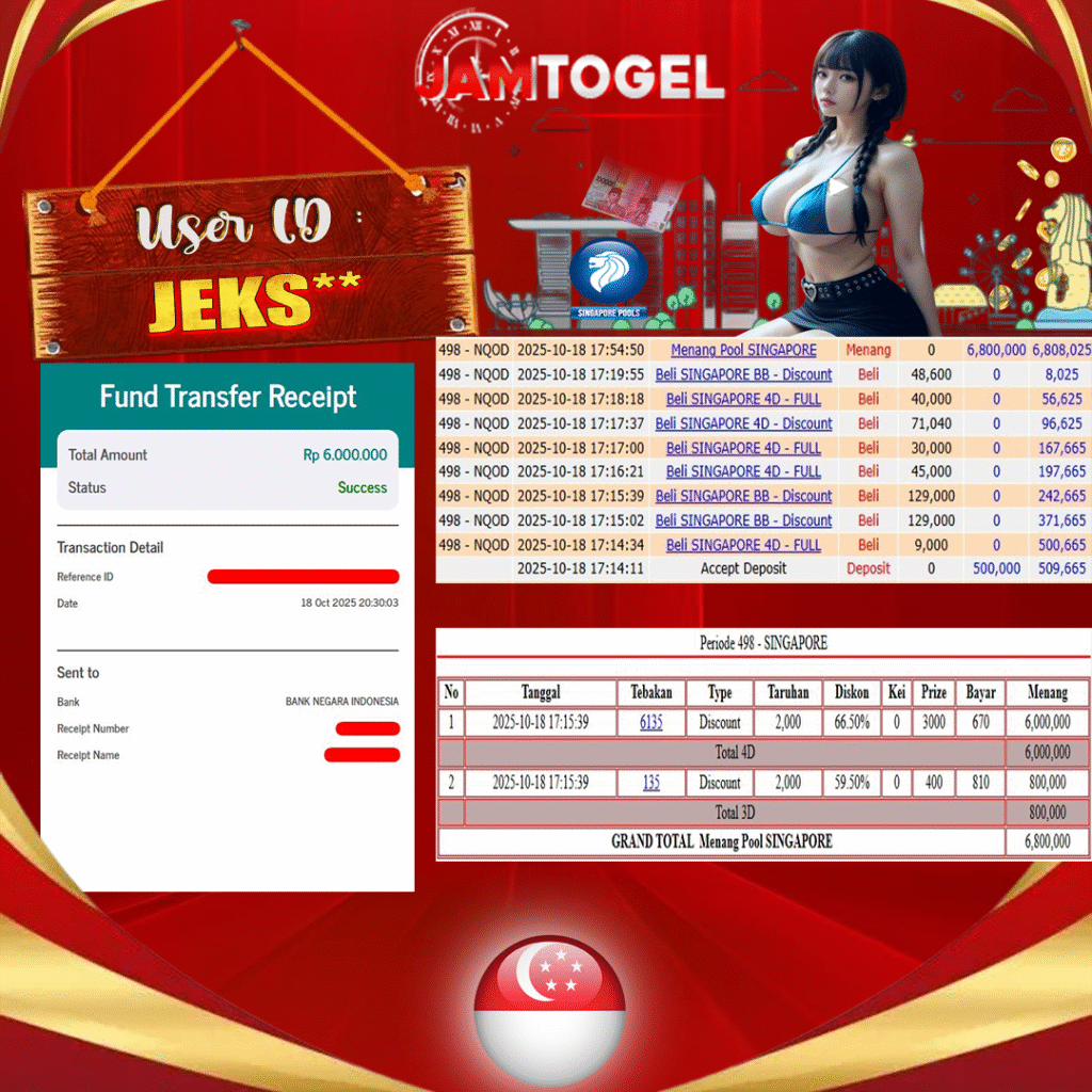 Selamat kepada member setia JAMTOGEL ID AS**100 Telah menang dalam permainan SINGAPORE POOLS RP 6,000,000, – LUNAS langsung mendarat ke rekening tanpa bertele – tele atau syarat apapun. Kami ucapkan terimakasih telah mempercayakan JAMTOGEL sebagai situs bandar terpercaya yang dijamin aman dikarenakan berapapun kemenangan member pasti LUNAS!