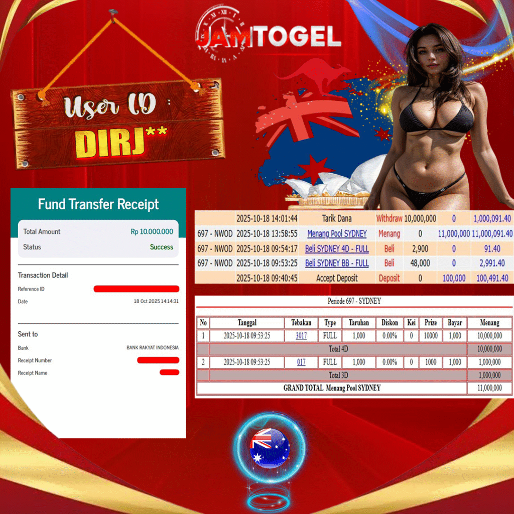 Selamat kepada member setia JAMTOGEL ID DIRJ** Telah menang dalam permainan SYDNEY RP 10,000,000, – LUNAS langsung mendarat ke rekening tanpa bertele – tele atau syarat apapun. Kami ucapkan terimakasih telah mempercayakan JAMTOGEL sebagai situs bandar terpercaya yang dijamin aman dikarenakan berapapun kemenangan member pasti LUNAS!