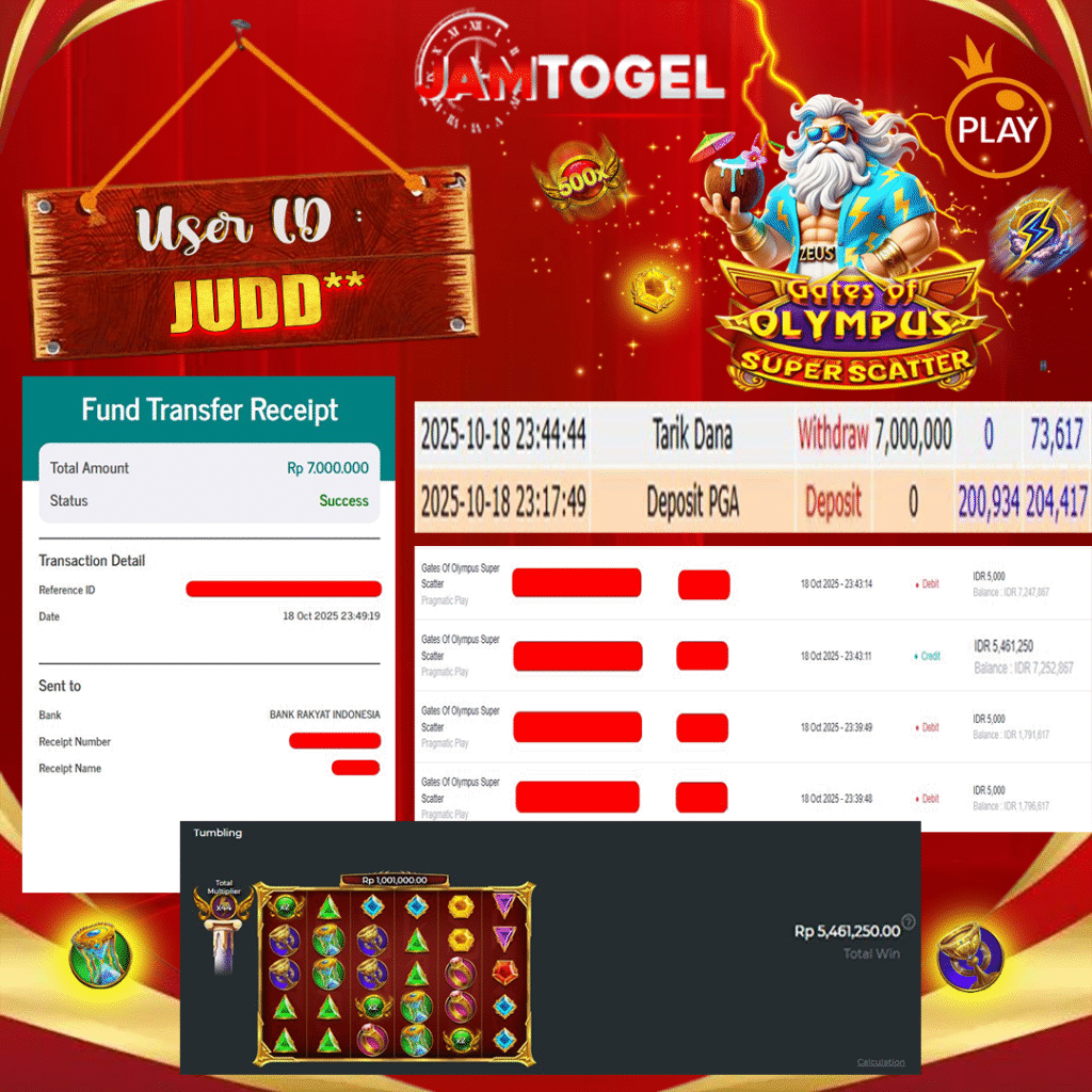 Selamat kepada member setia JAMTOGEL ID JUDD** Telah menang dalam permainan SLOT GATE OF OLYMPUS SUPER SCATTER RP 7,000,000 – LUNAS langsung mendarat ke rekening tanpa bertele – tele atau syarat apapun. Kami ucapkan terimakasih telah mempercayakan JAMTOGEL sebagai situs bandar terpercaya yang dijamin aman dikarenakan berapapun kemenangan member pasti LUNAS!