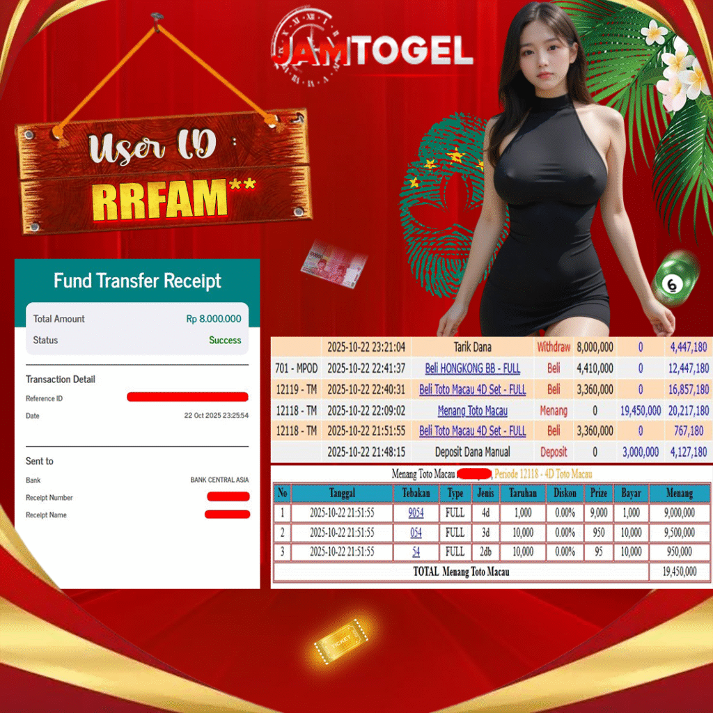 Selamat kepada member setia kami, an. RRFAM**, yang berhasil meraih kemenangan Luar Biasa di permainan TOGEL ONLINE TOTO MACAU dengan total hadiah sebesar Rp. 8,000,000