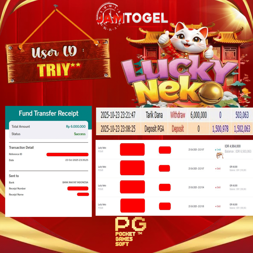 Selamat kepada member setia JAMTOGEL ID TRIY** Telah menang dalam permainan SLOT LUCKY NEKO RP 6,000,000, – LUNAS langsung mendarat ke rekening tanpa bertele – tele atau syarat apapun. Kami ucapkan terimakasih telah mempercayakan JAMTOGEL sebagai situs bandar terpercaya yang dijamin aman dikarenakan berapapun kemenangan member pasti LUNAS!