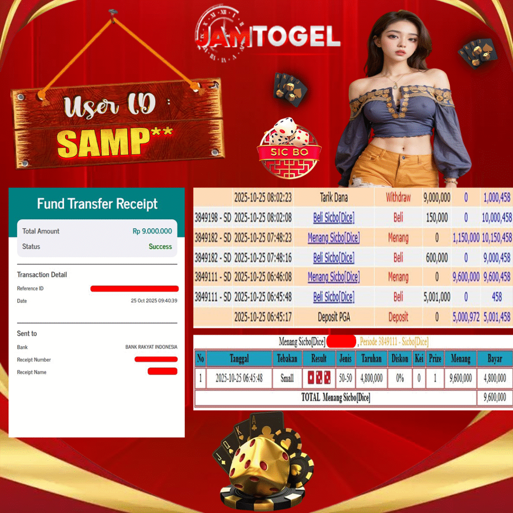 Selamat kepada member setia JAMTOGEL ID SAMP** Telah menang 2 Hari Berturut dalam permainan LIVE GAMES SICBO [DICE] RP 9,000,000, – LUNAS langsung mendarat ke rekening tanpa bertele – tele atau syarat apapun. Kami ucapkan terimakasih telah mempercayakan JAMTOGEL sebagai situs bandar terpercaya yang dijamin aman dikarenakan berapapun kemenangan member pasti LUNAS!