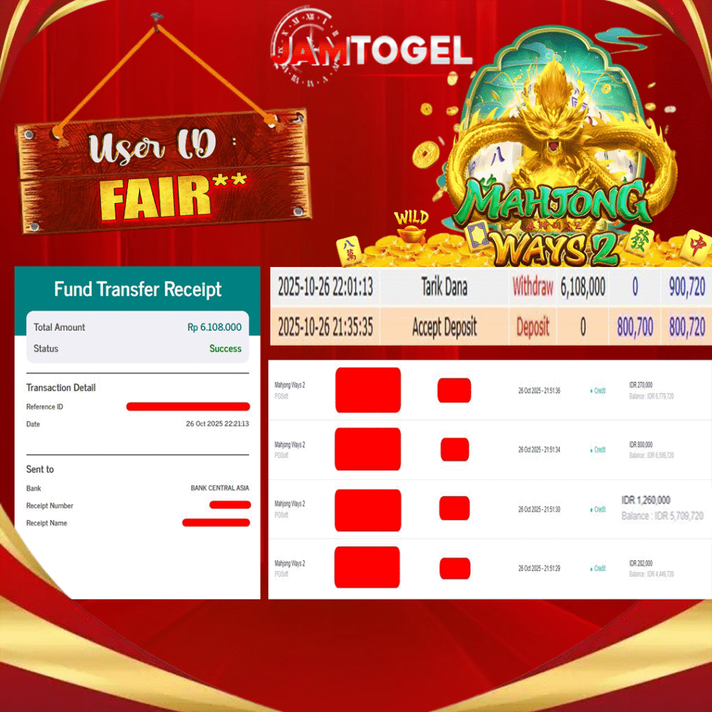 Selamat kepada member setia JAMTOGEL ID FAIR** Telah menang dalam permainan SLOT MAHJONG WAYS 2 RP 6.108,000, – LUNAS langsung mendarat ke rekening tanpa bertele – tele atau syarat apapun. Kami ucapkan terimakasih telah mempercayakan JAMTOGEL sebagai situs bandar terpercaya yang dijamin aman dikarenakan berapapun kemenangan member pasti LUNAS!