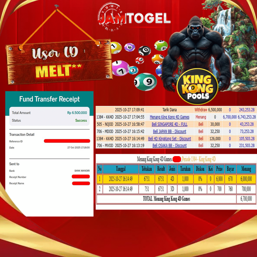 Selamat kepada member setia JAMTOGEL ID MELT** Telah menang dalam permainan KING KONG 4D POOLS RP 6,500,000, – LUNAS langsung mendarat ke rekening tanpa bertele – tele atau syarat apapun. Kami ucapkan terimakasih telah mempercayakan JAMTOGEL sebagai situs bandar terpercaya yang dijamin aman dikarenakan berapapun kemenangan member pasti LUNAS!