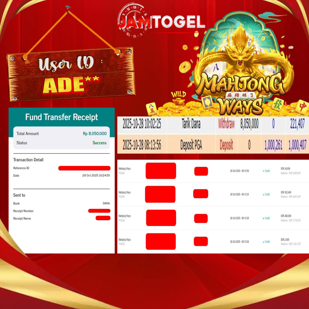 Selamat kepada member setia JAMTOGEL ID ADE** Telah menang dalam permainan SLOT MAHJONG WAYS RP 8.050,000, – LUNAS langsung mendarat ke rekening tanpa bertele – tele atau syarat apapun. Kami ucapkan terimakasih telah mempercayakan JAMTOGEL sebagai situs bandar terpercaya yang dijamin aman dikarenakan berapapun kemenangan member pasti LUNAS!