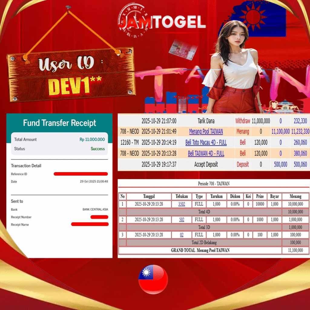 Selamat kepada member setia JAMTOGEL ID DEV1** Telah menang dalam permainan TAIWAN POOLS RP 11,000,000, – LUNAS langsung mendarat ke rekening tanpa bertele – tele atau syarat apapun. Kami ucapkan terimakasih telah mempercayakan JAMTOGEL sebagai situs bandar terpercaya yang dijamin aman dikarenakan berapapun kemenangan member pasti LUNAS!