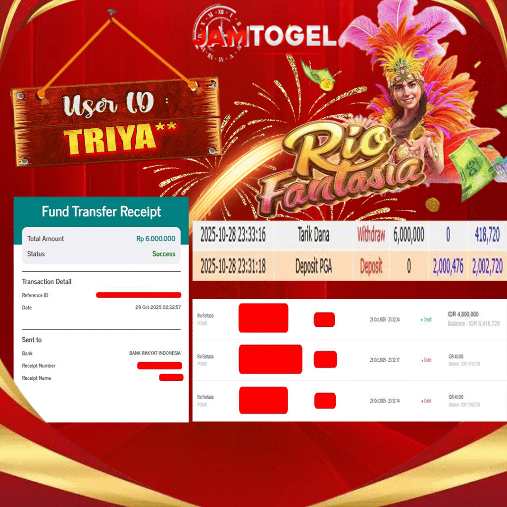 Selamat kepada member setia JAMTOGEL ID TRIYA** Telah menang dalam permainan SLOT RIO FANTASIA RP 6.000,000, – LUNAS langsung mendarat ke rekening tanpa bertele – tele atau syarat apapun. Kami ucapkan terimakasih telah mempercayakan JAMTOGEL sebagai situs bandar terpercaya yang dijamin aman dikarenakan berapapun kemenangan member pasti LUNAS!