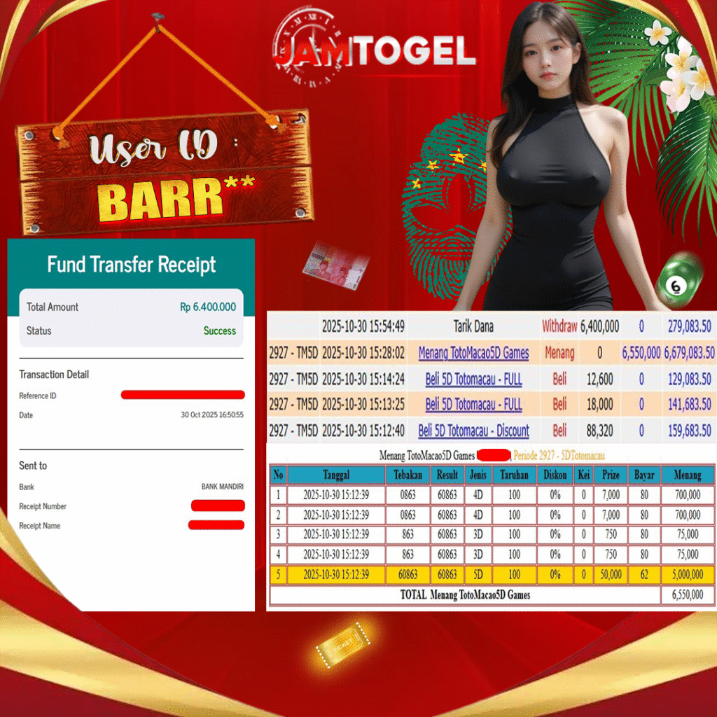 Selamat kepada member setia JAMTOGEL ID BARR** Telah menang dalam permainan TOTO MACAU 5D – 3D RP 6,400,000, – LUNAS langsung mendarat ke rekening tanpa bertele – tele atau syarat apapun. Kami ucapkan terimakasih telah mempercayakan JAMTOGEL sebagai situs bandar Togel online terpecaya dijamin aman dikarenakan berapapun kemenangan member pasti LUNAS!