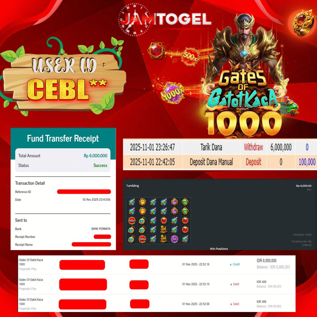 Selamat kepada member setia JAMTOGEL ID CEBL** Telah menang dalam permainan SLOT GATES OF GATOT KACA 1000 RP 6,000,000, – LUNAS langsung mendarat ke rekening tanpa bertele – tele atau syarat apapun. Kami ucapkan terimakasih telah mempercayakan JAMTOGEL sebagai situs bandar terpercaya yang dijamin aman dikarenakan berapapun kemenangan member pasti LUNAS!