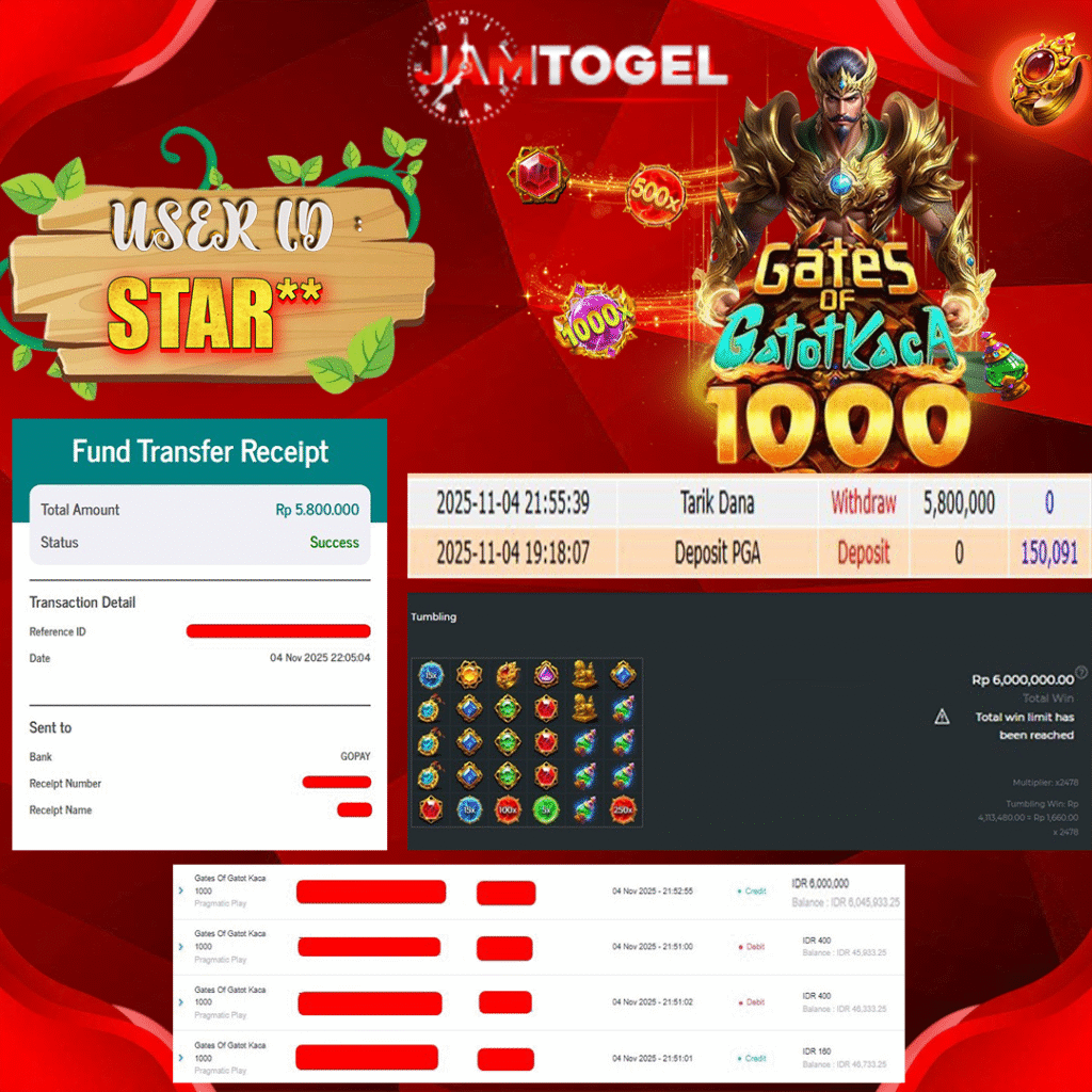 Selamat kepada member setia JAMTOGEL ID STAR** Telah menang dalam permainan SLOT GATES OF GATOT KACA 1000 RP 5,800,000, – LUNAS langsung mendarat ke rekening tanpa bertele – tele atau syarat apapun. Kami ucapkan terimakasih telah mempercayakan JAMTOGEL sebagai situs bandar terpercaya yang dijamin aman dikarenakan berapapun kemenangan member pasti LUNAS!