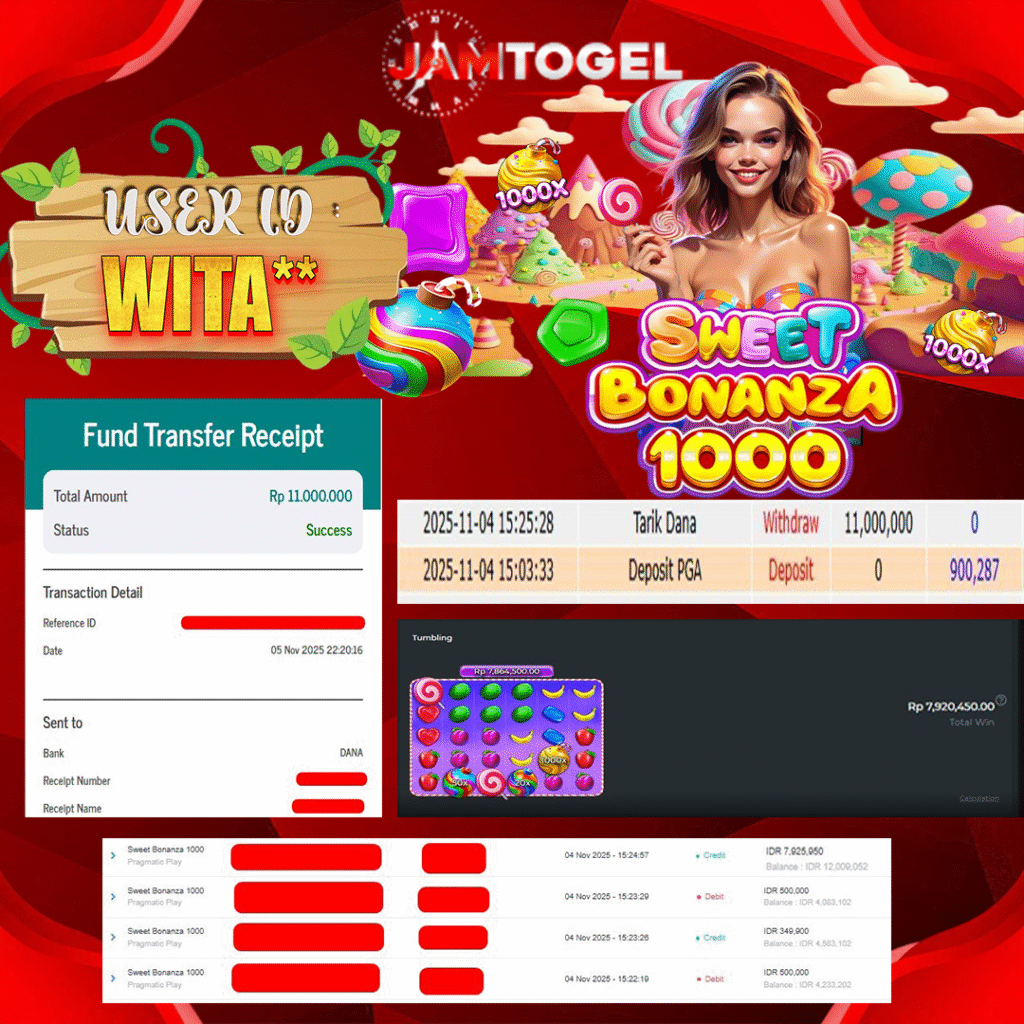 Selamat kepada member setia JAMTOGEL ID WITA** Telah menang dalam permainan SLOT SWEET BONANZA 1000 RP 11,000,000, – LUNAS langsung mendarat ke rekening tanpa bertele – tele atau syarat apapun. Kami ucapkan terimakasih telah mempercayakan JAMTOGEL sebagai situs bandar terpercaya yang dijamin aman dikarenakan berapapun kemenangan member pasti LUNAS!