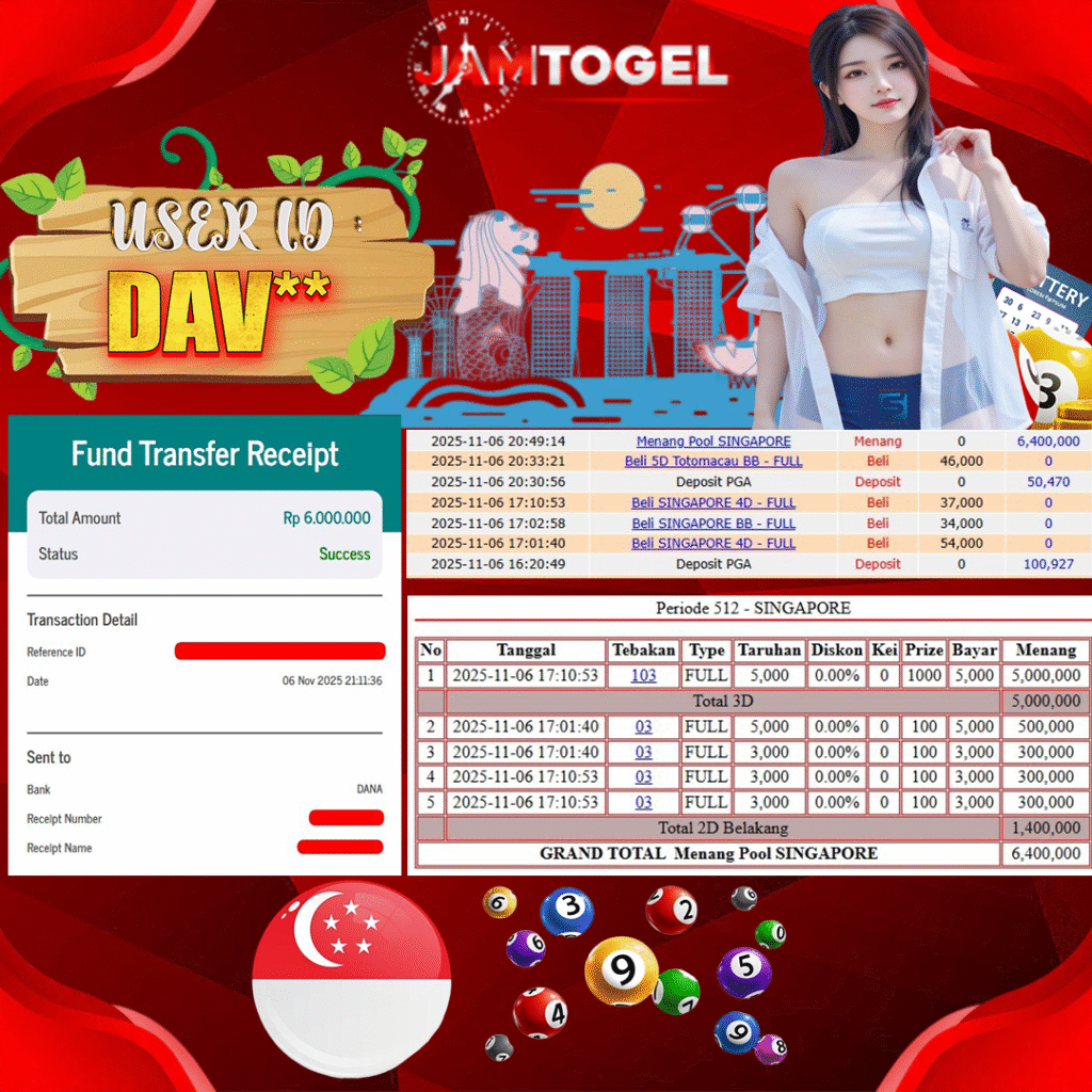 Selamat kepada member setia JAMTOGEL ID DAV**100 Telah menang dalam permainan SINGAPORE POOLS RP 6,000,000, – LUNAS langsung mendarat ke rekening tanpa bertele – tele atau syarat apapun. Kami ucapkan terimakasih telah mempercayakan JAMTOGEL sebagai situs bandar terpercaya yang dijamin aman dikarenakan berapapun kemenangan member pasti LUNAS!