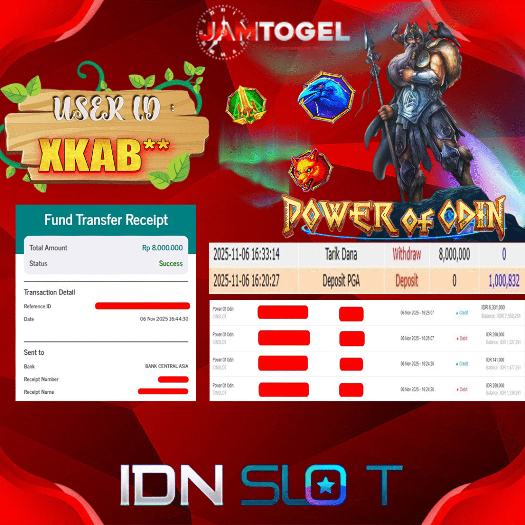 Selamat kepada member setia JAMTOGEL ID XKAB** Telah menang dalam permainan SLOT POWER OF ODIN RP 8.000,000, – LUNAS langsung mendarat ke rekening tanpa bertele – tele atau syarat apapun. Kami ucapkan terimakasih telah mempercayakan JAMTOGEL sebagai situs bandar terpercaya yang dijamin aman dikarenakan berapapun kemenangan member pasti LUNAS!