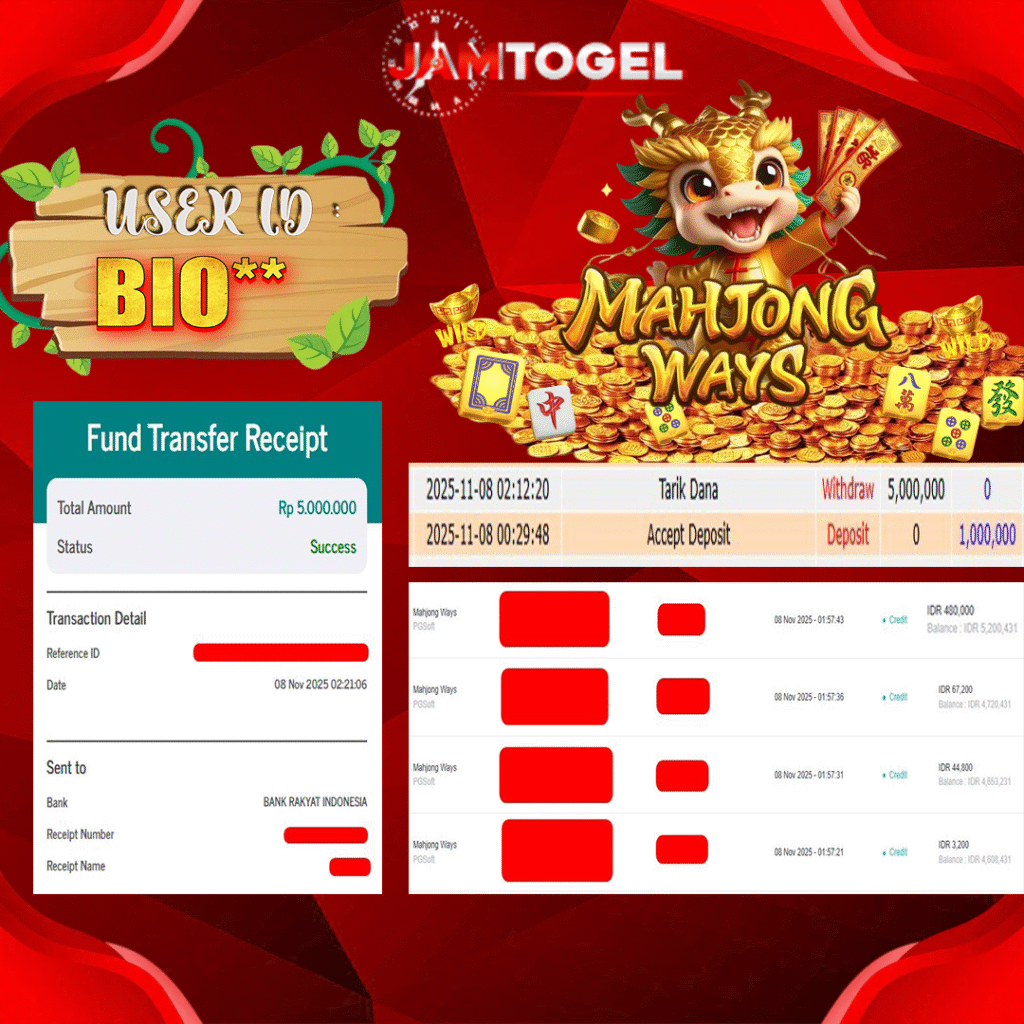 Selamat kepada member setia JAMTOGEL ID BIO** Telah menang dalam permainan SLOT MAHJONG WAYS RP 5.000,000, – LUNAS langsung mendarat ke rekening tanpa bertele – tele atau syarat apapun. Kami ucapkan terimakasih telah mempercayakan JAMTOGEL sebagai situs bandar terpercaya yang dijamin aman dikarenakan berapapun kemenangan member pasti LUNAS!