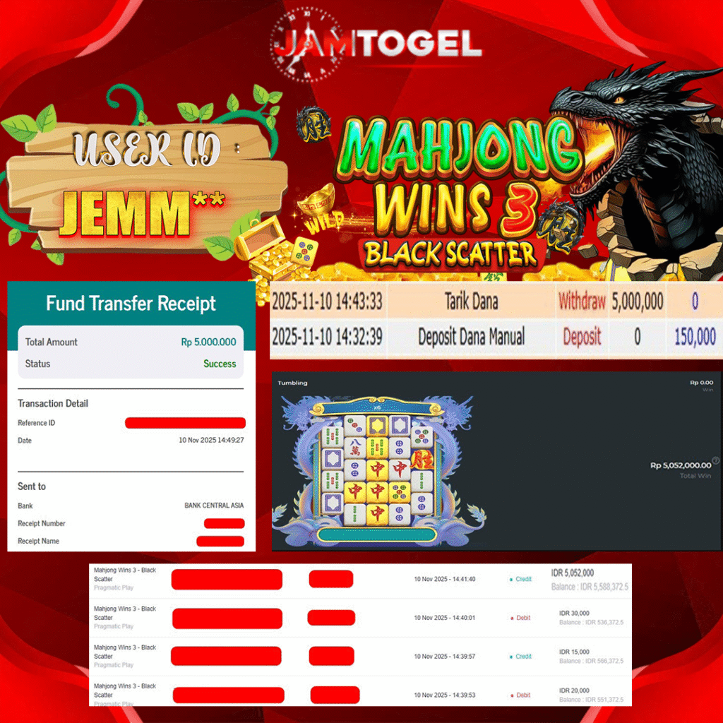 Selamat kepada member setia JAMTOGEL ID JEMM** Telah menang dalam permainan SLOT MAHJONG WINS 3 BLACK SCATTER RP 5,000,000, – LUNAS langsung mendarat ke rekening tanpa bertele – tele atau syarat apapun. Kami ucapkan terimakasih telah mempercayakan JAMTOGEL sebagai situs bandar terpercaya yang dijamin aman dikarenakan berapapun kemenangan member pasti LUNAS!