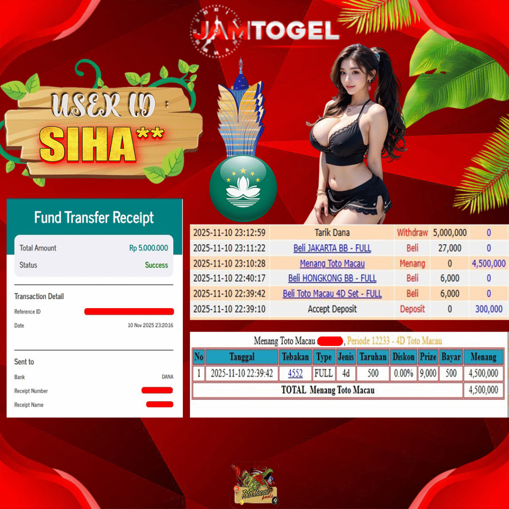 Selamat kepada member setia JAMTOGEL ID SIHA** Telah menang dalam permainan TOTO MACAU RP 5,000,000, – LUNAS langsung mendarat ke rekening tanpa bertele – tele atau syarat apapun. Kami ucapkan terimakasih telah mempercayakan JAMTOGEL sebagai situs bandar Togel online terpecaya dijamin aman dikarenakan berapapun kemenangan member pasti LUNAS!