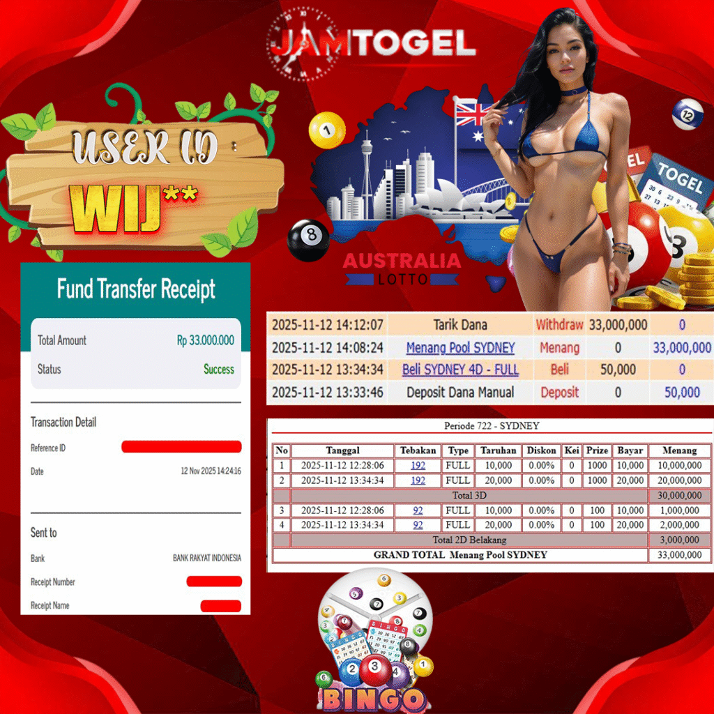 Selamat kepada member setia JAMTOGEL ID WIJ** Telah menang dalam permainan SYDNEY RP 33,000,000, – LUNAS langsung mendarat ke rekening tanpa bertele – tele atau syarat apapun. Kami ucapkan terimakasih telah mempercayakan JAMTOGEL sebagai situs bandar terpercaya yang dijamin aman dikarenakan berapapun kemenangan member pasti LUNAS!