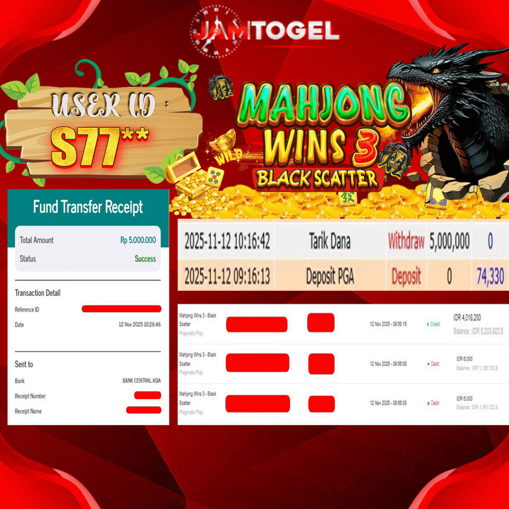 Selamat kepada member setia JAMTOGEL ID S77** Telah menang dalam permainan SLOT MAHJONG WINS 3 BLACK SCATTER RP 5,000,000, – LUNAS langsung mendarat ke rekening tanpa bertele – tele atau syarat apapun. Kami ucapkan terimakasih telah mempercayakan JAMTOGEL sebagai situs bandar terpercaya yang dijamin aman dikarenakan berapapun kemenangan member pasti LUNAS!