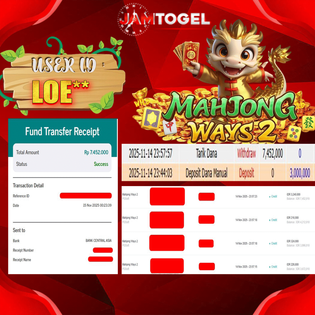 Selamat kepada member setia JAMTOGEL ID LOE** Telah menang dalam permainan SLOT MAHJONG WAYS 2 RP 7.452,000, – LUNAS langsung mendarat ke rekening tanpa bertele – tele atau syarat apapun. Kami ucapkan terimakasih telah mempercayakan JAMTOGEL sebagai situs bandar terpercaya yang dijamin aman dikarenakan berapapun kemenangan member pasti LUNAS!
