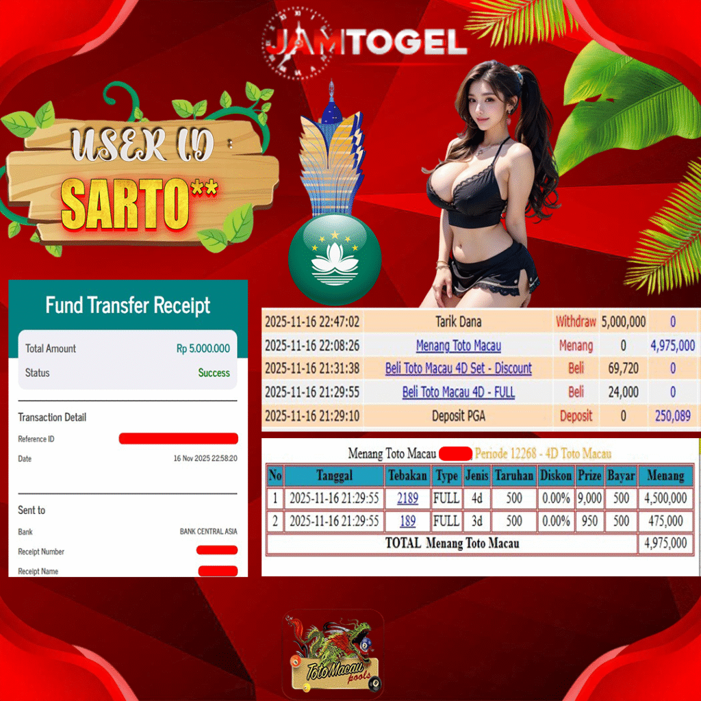 Selamat kepada member setia JAMTOGEL ID SARTO** Telah menang dalam permainan TOTO MACAU RP 5,000,000, – LUNAS langsung mendarat ke rekening tanpa bertele – tele atau syarat apapun. Kami ucapkan terimakasih telah mempercayakan JAMTOGEL sebagai situs bandar Togel online terpecaya dijamin aman dikarenakan berapapun kemenangan member pasti LUNAS!