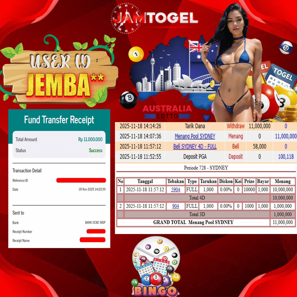 Selamat kepada member setia JAMTOGEL ID JEMBA** Telah menang dalam permainan SYDNEY RP 11,000,000, – LUNAS langsung mendarat ke rekening tanpa bertele – tele atau syarat apapun. Kami ucapkan terimakasih telah mempercayakan JAMTOGEL sebagai situs bandar terpercaya yang dijamin aman dikarenakan berapapun kemenangan member pasti LUNAS!