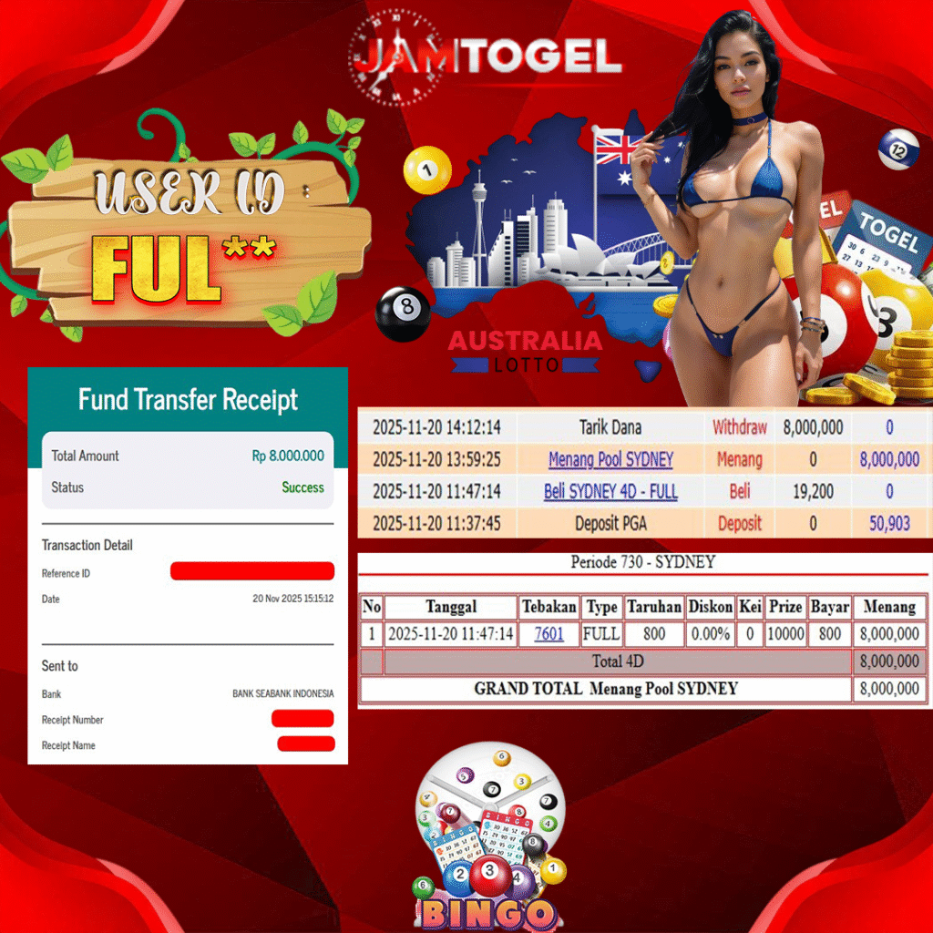 Selamat kepada member setia JAMTOGEL ID FULL** Telah menang dalam permainan SYDNEY RP 8,000,000, – LUNAS langsung mendarat ke rekening tanpa bertele – tele atau syarat apapun. Kami ucapkan terimakasih telah mempercayakan JAMTOGEL sebagai situs bandar terpercaya yang dijamin aman dikarenakan berapapun kemenangan member pasti LUNAS!