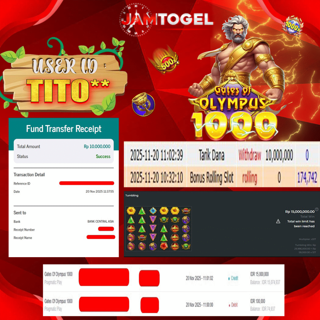 Selamat kepada member setia JAMTOGEL ID TITO**Telah menang dalam permainan SLOT GATE OF OLYMPUS 1000 RP 10,000,000 – LUNAS langsung mendarat ke rekening tanpa bertele – tele atau syarat apapun. Kami ucapkan terimakasih telah mempercayakan JAMTOGEL sebagai situs bandar terpercaya yang dijamin aman dikarenakan berapapun kemenangan member pasti LUNAS!