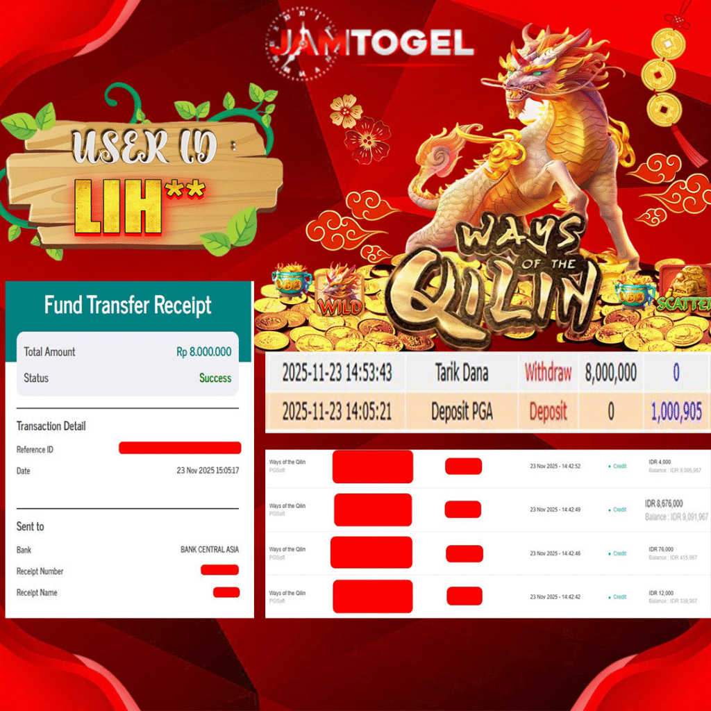 Selamat kepada member setia JAMTOGEL ID LIH** Telah menang dalam permainan SLOT WAYS OF THE QILIN RP 8.000,000, – LUNAS langsung mendarat ke rekening tanpa bertele – tele atau syarat apapun. Kami ucapkan terimakasih telah mempercayakan JAMTOGEL sebagai situs bandar terpercaya yang dijamin aman dikarenakan berapapun kemenangan member pasti LUNAS!
