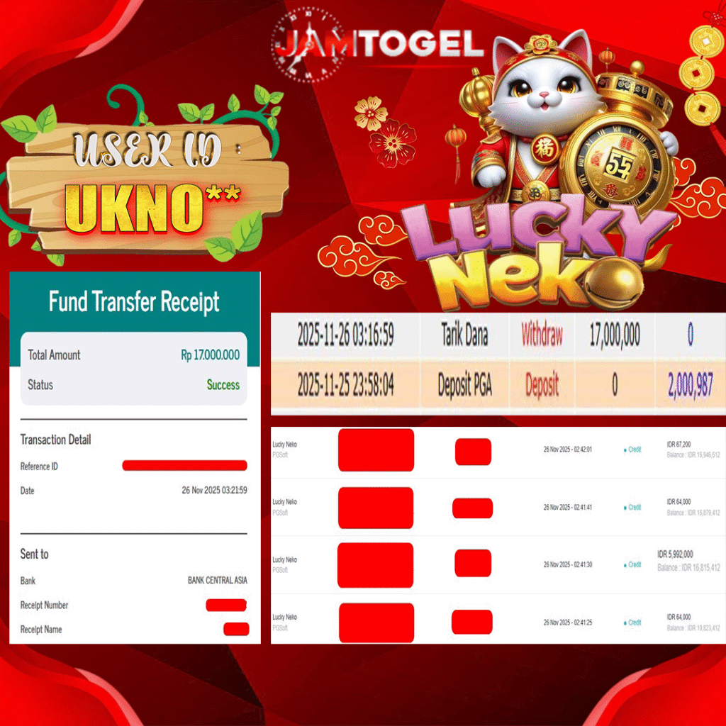Selamat kepada member setia JAMTOGEL ID UKNO** Telah menang dalam permainan SLOT LUCKY NEKO RP 17,000,000, – LUNAS langsung mendarat ke rekening tanpa bertele – tele atau syarat apapun. Kami ucapkan terimakasih telah mempercayakan JAMTOGEL sebagai situs bandar terpercaya yang dijamin aman dikarenakan berapapun kemenangan member pasti LUNAS!