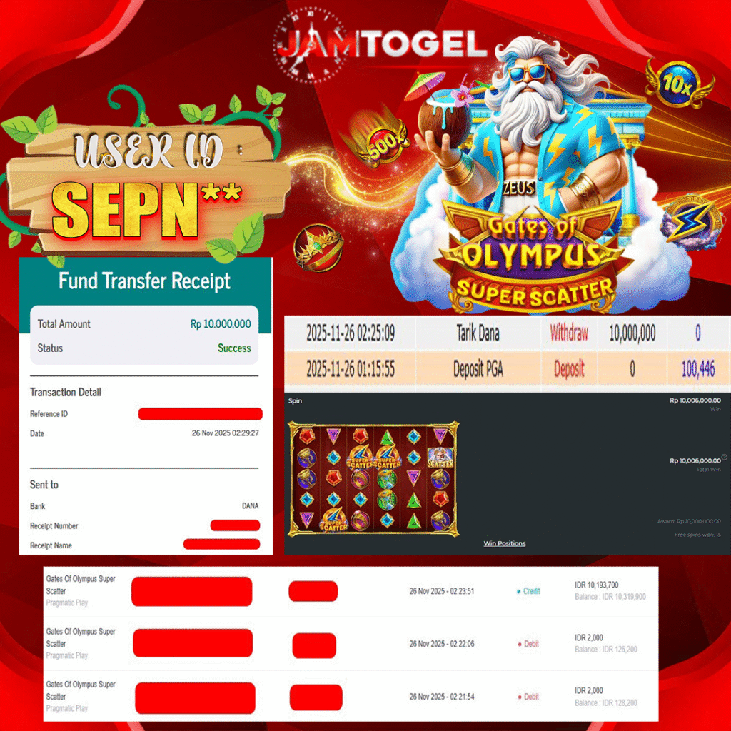Selamat kepada member setia JAMTOGEL ID SEPN** Telah menang dalam permainan SLOT GATE OF OLYMPUS SUPER SCATTER RP 10,000,000 – LUNAS langsung mendarat ke rekening tanpa bertele – tele atau syarat apapun. Kami ucapkan terimakasih telah mempercayakan JAMTOGEL sebagai situs bandar terpercaya yang dijamin aman dikarenakan berapapun kemenangan member pasti LUNAS!