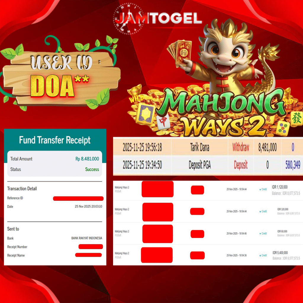 Selamat kepada member setia JAMTOGEL ID DOA** Telah menang dalam permainan SLOT MAHJONG WAYS 2 RP 8.481,000, – LUNAS langsung mendarat ke rekening tanpa bertele – tele atau syarat apapun. Kami ucapkan terimakasih telah mempercayakan JAMTOGEL sebagai situs bandar terpercaya yang dijamin aman dikarenakan berapapun kemenangan member pasti LUNAS!